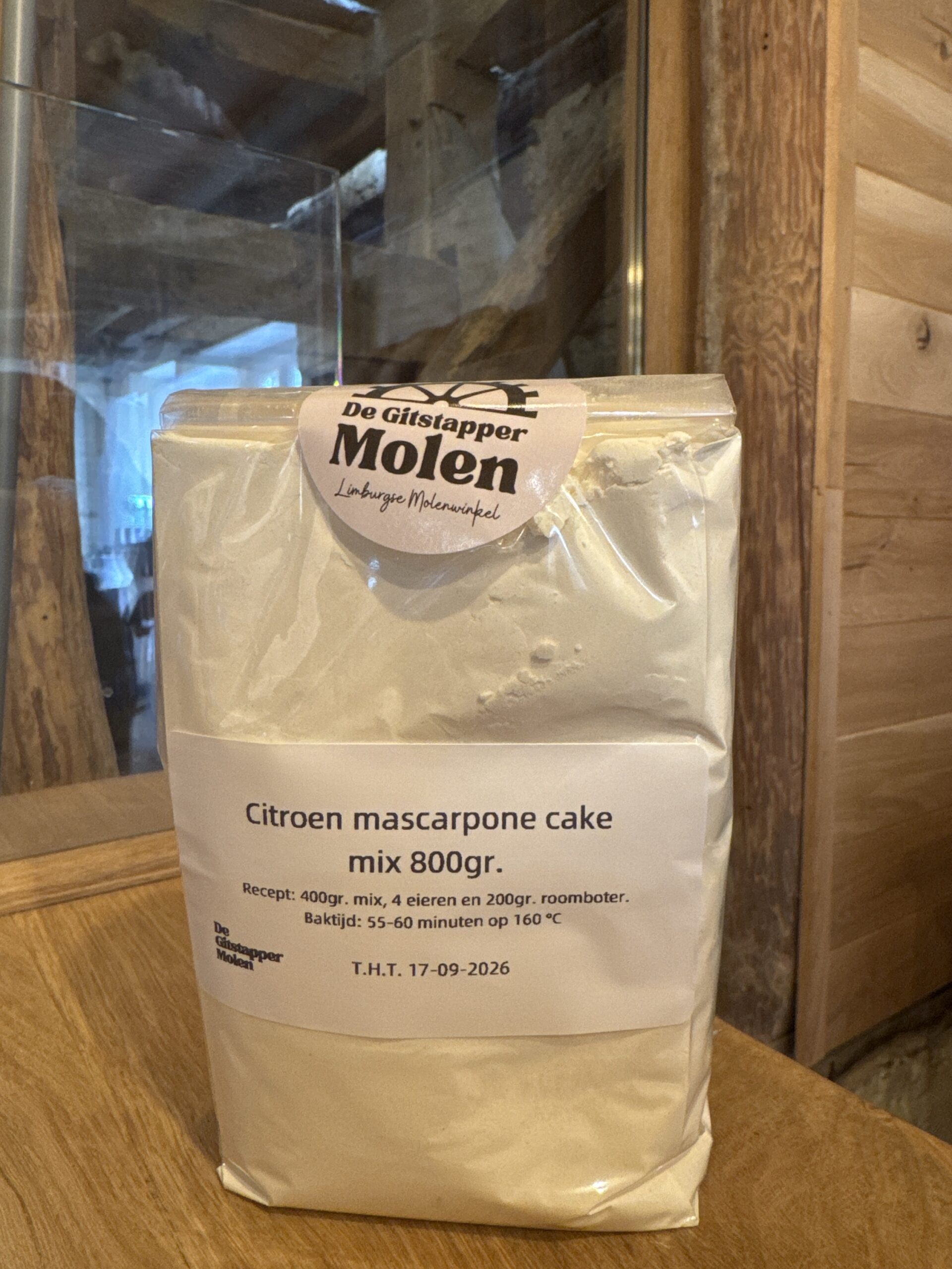 Citroen mascarpone cake mix. Zelf toevoegen: eieren en roomboter. Verpakking 800 gram, voor 2 cakes. Recept staat op de verpakking.