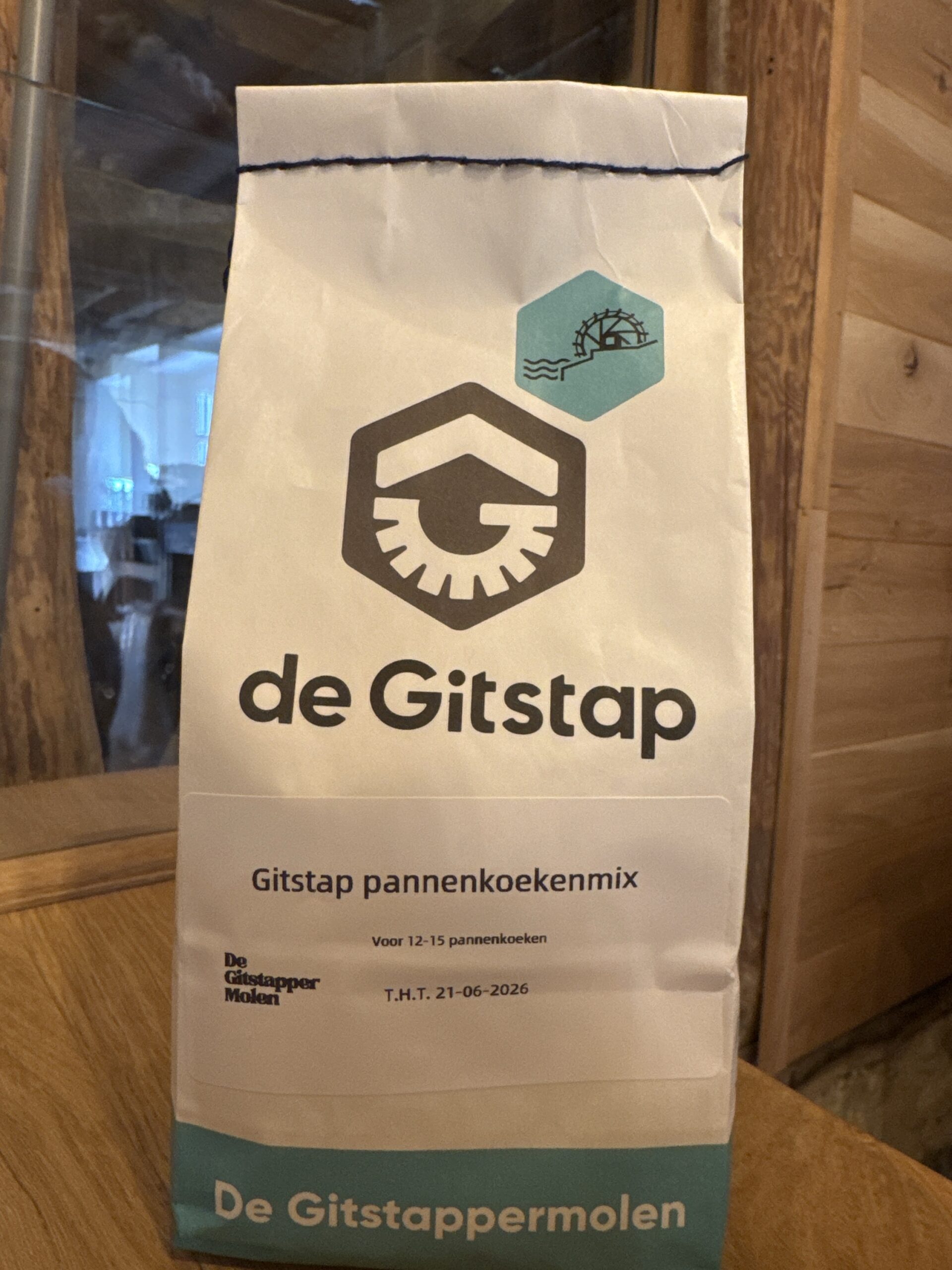 De Gitstap pannenkoekenmix, gemaakt met eigen receptuur op basis van spelt. Voor 12 tot 15 pannenkoeken. Zelf nog eieren en melk toevoegen.